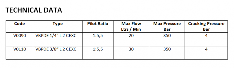Pilot check valves are used to block the actuator in both directions. Flow is free in one direction and blocked in the reverse direction until pilot pressure is applied. They are easily assembled on a cylinder. We supply on request fittings kit for mounting on cylinders with a specific centre distance.